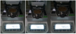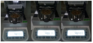 - 用實(shí)驗勺取3g酒糟(93/94)均勻鋪在樣品盤(pán)上,設置好合適的溫度后蓋下上蓋,按下“START”鍵開(kāi)始測試;蜂鳴兩聲后,儀器自動(dòng)停機,測試結束,可在液晶顯示屏查看測試后酒糟的水含量為46.433%;